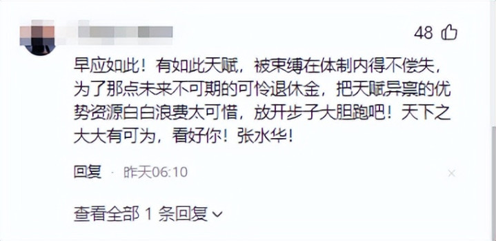 早应如斯!有如斯天资,被拘谨在体制内以珠弹雀,为了那点改日不能期的戚然退休金,把天资异禀的上风资源白白蚀本太可惜,放开步子果敢跑吧!天地之大出息万里,看好你!张水华!
