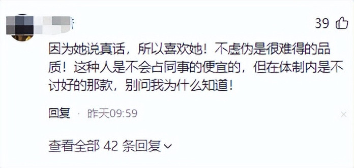 因为她说实话,是以可爱她!不乖谬是很贫苦的品性!这种东谈主是不会占共事的低廉的,但在体制内是不勾搭的那种,别问我为什么知谈!