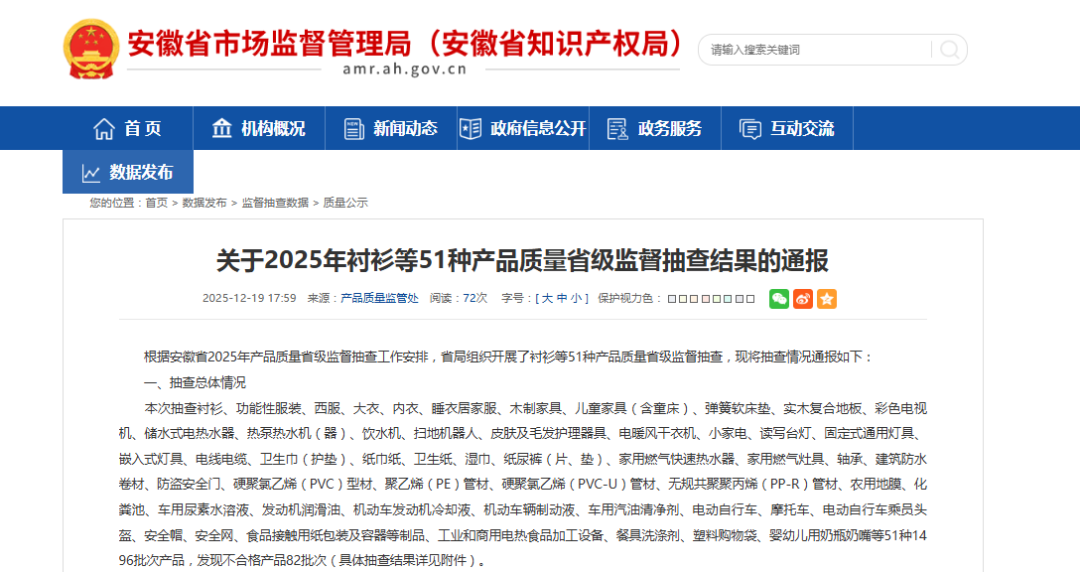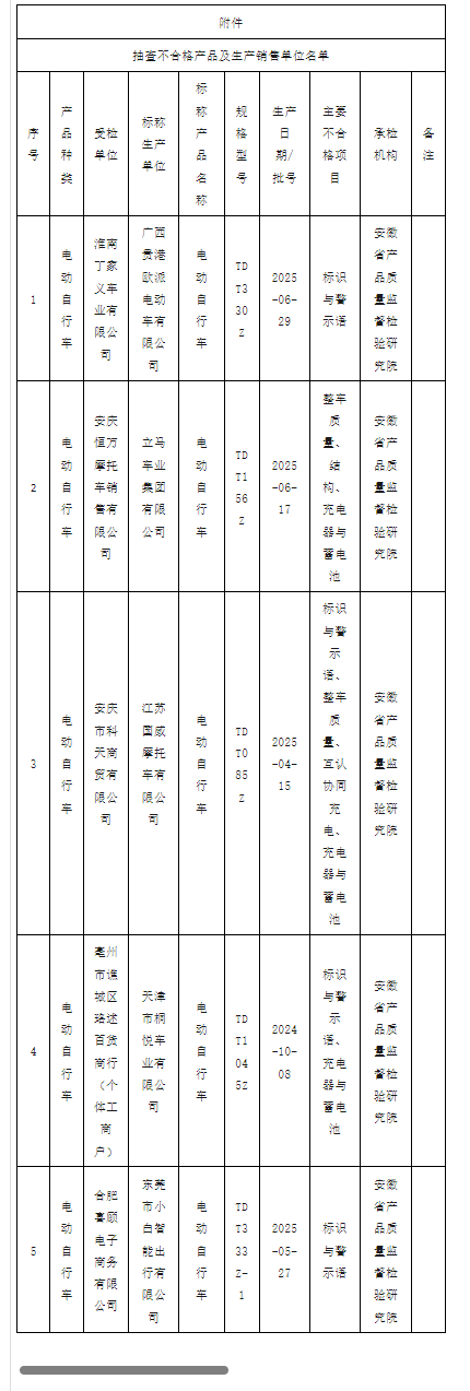 近日,安徽省市集监管局网站发布2025年电动自行车等51种产物性量省级监督抽查成果。