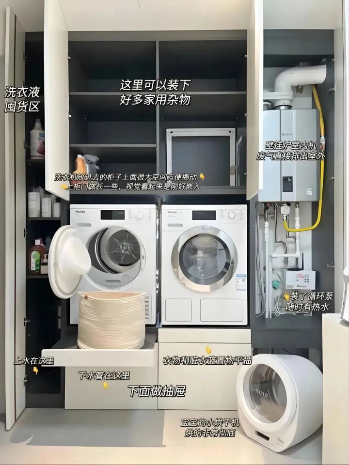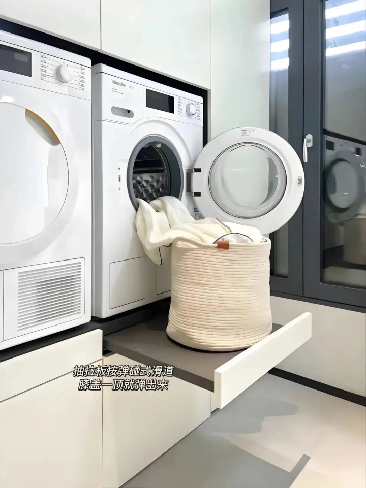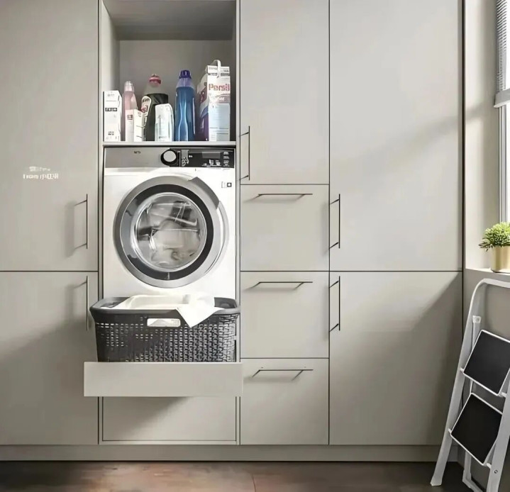 我们在定制柜子的时期,还不错在底部留个30cm的闲隙,配上抽拉层板,嗅觉就像把洗衣机塞进了“智能小车库”。
