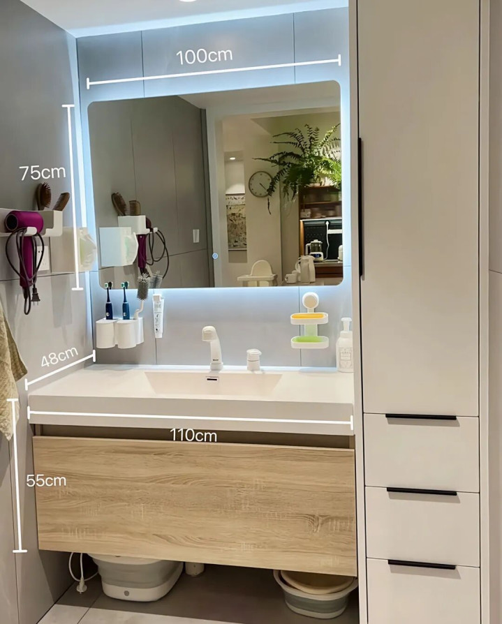 这个柜子就像一个微型收纳神器,护肤品、化妆品、洗漱用品、清洁用品……齐备齐不错塞进去!这样洗手盆上的“杂物战场”陡然形成了“整洁高地”,既好意思不雅又实用,完全是一种看得见的幸福感!