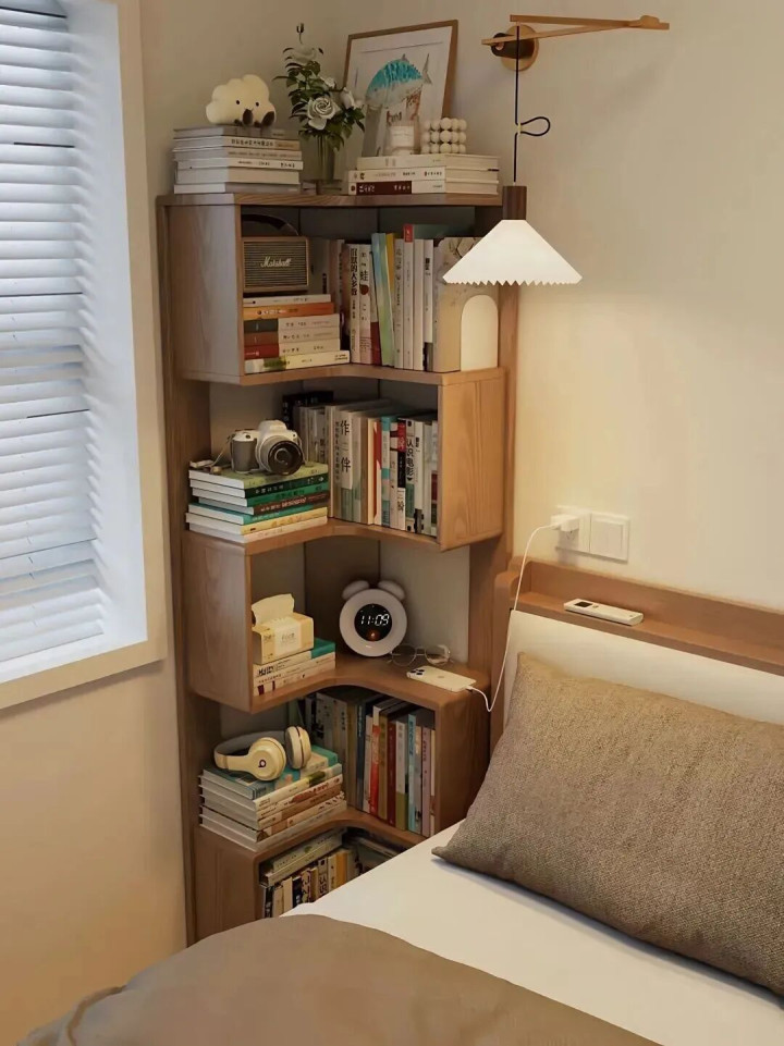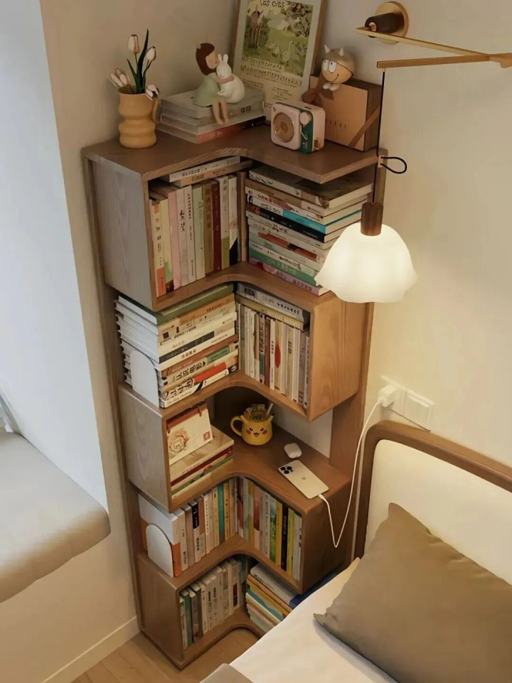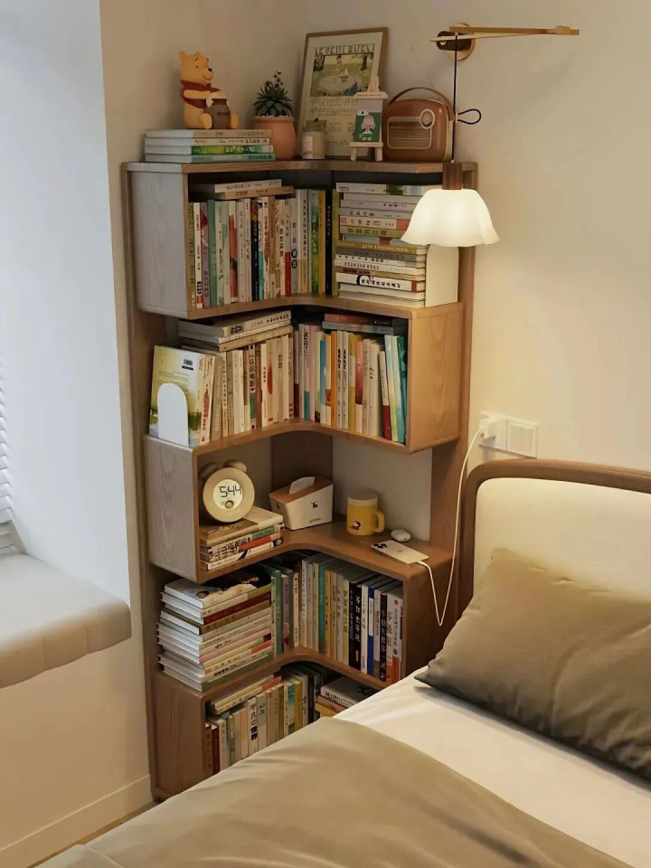 但目前,越来越多的东谈主启动不要床头柜了,他们会用个转角书架来“冲破成例”。