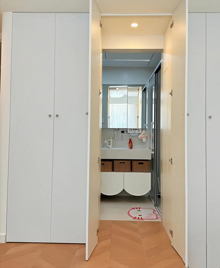 从外不雅上看,简直是个“藏在深处的巧妙”,一个看似庸碌的衣柜,谁能猜测一打开柜门,你就不错径直插足卫生间?而双方的柜门才是真是存放衣裳的场合,卫生间那门但是伪装妙手。
